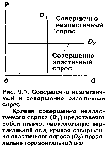 Исходя из формулы, спрос является эластичным, если данное процентное изменение цены ведет к большему процентному изменению количества спрашиваемой продукции. Например, если снижение цены на 2% вызывает рост спроса на 4%, то спрос является эластичным. Когда спрос эластичен, коэффициент эластичности будет больше единицы. Если данное процентное изменение цены сопровождается относительно меньшим изменением количества спрашиваемой продукции, то спрос является неэластичным. Если снижение цены на 3% дает в результате рост количества спрашиваемой продукции всего на 1%, спрос неэластичен. Коэффициент эластичности в этом случае меньше единицы и составит 1/3. Когда спрос неэластичен, коэффициент эластичности всегда будет меньше единицы. Между эластичным и неэластичным спросом возникает пограничная ситуация, когда процентное изменение цены и последующее процентное изменение количества спрашиваемой продукции оказываются равными по величине. Если падение цены на 1% вызывает рост продаж на 1%, то этот специфический случай называют единичной эластичностью, так как коэффициент эластичности в точности равен единице. Следует подчеркнуть, что говоря о неэластичном спросе, экономисты не имеют в виду абсолютную нечувствительность потребителей к изменению цен. Совершенно неэластичный спрос означает крайний случай, когда изменение цены не приводит ни к какому изменению количества спрашиваемой продукции. Примером может служить спрос больных острой формой диабета на инсулин или же спрос наркоманов на наркотики. Какая бы ни была цена, пусть в 100 раз больше первоначальной, все равно будут покупать алкоголь, сигареты, наркотики, инсулин и т.д. Графически этот случай показывают при помощи кривой спроса, параллельной вертикальной оси (например, D1 на рис. 9.1).