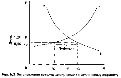 Потолок цен представляет собой законодательно установленную максимальную цену, которую продавцу разрешается запрашивать за свой товар или услугу. Эти потолки цен позволяют потребителям приобретать некоторые товары первой необходимости или услуги, которые они не смогли бы купить при равновесных ценах. В широких масштабах потолки цен или общий контроль за ценами применяются для ограничения инфляционных процессов в экономике. Установление ценового потолка создает и более серьезную проблему — препятствует изменению цен, что абсолютно необходимо для эффективности распределения ресурсов. Например, контроль за квартирной платой не позволяет ей увеличиваться и таким образом сигнализировать о прибыльности перераспределения ресурсов в пользу жилищного строительства.