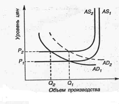Предположим, что по какой-то причине кривая совокупного предложения AS1 сместилась вверх на плоскости в положение AS2 (см. рис.). Равновесная цена P1, соответствовавшая точке равновесного производства Q1, нарушена, и новый равновесный уровень цен устанавливается в точке P2. Если совокупный спрос тоже увеличится и будет равен прежним объемам равновесного потребления, то кривая совокупного спроса AD1 сместится вправо в положение ad2. В этом случае произойдет только рост цен, уровни занятости и производства останутся прежними. Если совокупный спрос не увеличится одновременно с удорожанием совокупного предложения, то точка равновесного объема производства сместится из Q1 в Q2. В этом случае произойдет рост цен, а также сократятся уровни занятости и производства. Состояние экономики, когда используются не все ресурсы: существуют незагруженные производственные мощности, хроническая безработица, называется стагнацией. Если стагнация сопровождается инфляцией, то такое экономическое положение называется стагфляцией. То есть смещение точки равновесного производства в точку Q2, а равновесной цены—в точку P2 называется стагфляцией. Действие каких факторов смещает кривую совокупного предложения AS на плоскости? Можно выделить внешние и внутренние факторы. Внешние факторы включают экономические, правовые, политические и другие составляющие. Экономические факторы — это мировые цены на ресурсы, перевозки и т. д. На первом месте здесь стоят цены на сырье и энергоносители, повышение которых вызовет рост издержек и необходимость увеличения практически всех цен. Например, повышение мировых цен на нефть в 1973—1974 и 1979—1980 гг. вызвало инфляцию в большинстве стран. Правовые факторы—это лицензионные и патентные ограничения, таможенные правила и т. д. Политические факторы—это ограничения или запреты на торговлю с какими-то странами и т. д. Например, экономическая блокада Ирака. Внутренние экономические факторы обусловлены состоянием национальной экономики. В их основе лежат рост издержек на единицу продукции и существование на многих рынках несовершенной конкуренции. Следует рассмотреть действия фирм, занимающих монопольное или олигопольное положение на рынках, а также действия профсоюзов, занимающих монопольное положение на рынке труда развитых стран. Действия фирм. Поскольку олигополистический рынок—это рынок несовершенной, ограниченной конкуренции, фирмы, действующие на нем, могут по своему усмотрению повысить цены. Рост цен снижает уровень жизни и заставляет профсоюзы добиваться повышения заработной платы. Повышение заработной платы увеличивает издержки, и фирмы вновь повышают цены. Начинает разворачиваться инфляционная спираль. Действия профсоюзов. Если в экономике существовало равновесие и профсоюзы добились повышения зарплаты, то фирмы могут либо уволить часть работников, чтобы производство оставалось выгодным, либо повысить цены, чтобы компенсировать выросшие издержки. Естественно, что профсоюзы будут противодействовать увольнениям, поэтому остается только повысить цены. Рост цен заставит профсоюзы вновь добиваться повышения заработной платы... Инфляционная спираль начинает раскручиваться. Следует отметить следующее важное отличие. Если инфляция спроса при прочих равных условиях может развиваться бесконечно, то инф