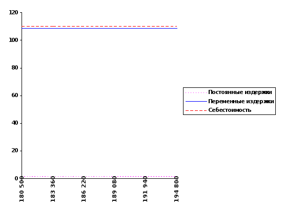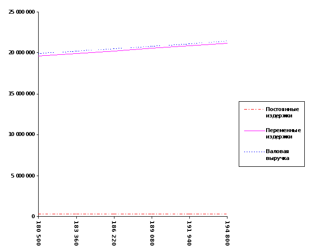 За максимальную границу программы принимаем наибольшее значение из всех N. Наибольшим значением получилось N1, которое равно 194800 штук. Таким образом без изменения числа оборудования программа выпуска может изменятся от заданной до максимальной, т.е. от 180 500 до 194 800 штук. Этот интервал разбиваем на 5 равных промежуточных значений программы выпуска. Для этих промежутков считаем постоянные, переменные и валовые издержки. Постоянные издержки равны постоянным издержкам на одно изделие из таблицы 4.1 умноженным на заданную программу выпуска: ПОИ=180 500 *1 566 = 282 663 тыс. руб. Переменные издержки равны переменным издержкам на одно изделие умноженным на полученные программы выпуска: ПИ1=180 500 * 108 668 = 19 614 574 тыс. руб. ПИ2=183 360 * 108 668 = 19 925 364 тыс. руб. ПИ3=186 220 * 108 668 = 20 236 155 тыс. руб. ПИ4=189 080 * 108 668 = 20 546 945 тыс. руб. ПИ5=191 940 * 108 668 = 20 857 736 тыс. руб. ПИ6=194 800 * 108 668 = 21 168 526 тыс. руб. Валовые издержки это сумма постоянных и переменных издержек. Результаты выше приведенных расчетов сводятся в таблицу 4.2. Таблица 4.2 Расчет валовых издержек предприятия