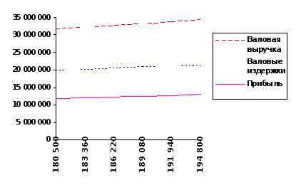 Рис 4.2. Динамика валовой себестоимости. Валовая выручка - это произведение цены на программу выпуска. Прибыль - это валовая выручка минус валовые издержки. Таблица 4.4 Расчет прибыли предприятия