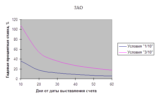 Выполняя предложенное условие необходимо одновременное изменение нескольких характеристик текущей кредитной политики: 1) увеличение периода предоставления кредита до 45 дней; 2) введение системы скидок: 3 % («3 / 10, n / 45»); 3) повышение стоимости кредита с 12 % до 24 % в год, что должно стимулировать клиентов воспользоваться скидкой. Сравнительный анализ условий кредита, установленного в настоящее время в ЗАО «», и предложенных условий кредита приведен на рисунке 9. И в том и другом случае, при неизменной величине скидки, стоимость коммерческого кредита уменьшается по мере увеличения срока кредита. Расчет приводится в приложении № 12. Рис. 9. Зависимость между годовым процентом стоимости коммерческого кредита и периодом времени