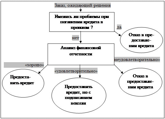 4) установление стандартов кредитоспособности. Решение о кредите должно основываться на предпочтении надежности платежа. При анализе кредитоспособности рекомендуется использование метода «3 С»: желание (character) (т. е. степень стремления выполнить свои долговые обязательства), способность (capacity) (т. е. способность генерировать денежные средства, необходимые для выполнения принятых на себя долговых обязательств) и капитал (capital) (т. е. размер чистого собственного капитала и коэффициент соотношения чистого собственного и заемного капитала). Целесообразно также формирование информационной базы, сгруппировав покупателей по уровню кредитоспособности. Для ее разработки можно использовать информацию по исполнению платежей, данные об участии фирмы в официальных мероприятиях, судебных разбирательствах, арбитраже, а также иные сведения, характеризующие контрагентов; общую информацию – структура фирмы, ее история, биографические данные руководителей, список банков, ведущих дела с компанией отзыв о компании, публикуемый в прессе. На основе всей этой информации необходимо принять решение о возможности кредита. Для этого стоит воспользоваться методом «дерево решений», наиболее доступным и популярным методом в менеджменте. Использование данного инструмента в фирме «» видится в такой схеме: Рис. 10. «Дерево решений» по предоставлению кредита или об отказе от него