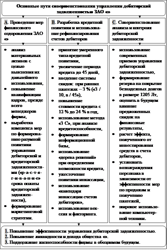 Ожидаемый совокупный эффект от изменений в управлении дебиторской задолженностью ЗАО «» – повышение эффективности управления дебиторской задолженностью, повышение ликвидности, дохода, поддержание жизнеспособности фирмы в обозримом будущем. Обсудив, основные направления совершенствования управления дебиторской задолженностью общества «», можно сформулировать вывод. ВЫВОД ПО ГЛАВЕ II Выполненный анализ управления дебиторской задолженностью ЗАО «» позволяет автору сделать следующие выводы и предложения для повышения эффективности управления дебиторской задолженностью ЗАО «»: Выводы: 1. Вывод, который следует из предварительной оценки финансового положения ЗАО «» - общество находится на краю банкротства, что подтверждают низкий коэффициент ликвидности и высокий коэффициент финансовой зависимости. 2. Подводя краткие итоги анализа дебиторской задолженности, можно заключить, что ЗАО «» имеет низкий уровень ликвидности дебиторской задолженности, т. е. ее способности конвертироваться в денежные средства без значительной потери в цене. Это подтверждается недостаточной оборачиваемостью дебиторской задолженности, уменьшением объема дебиторской задолженности, низким качеством дебиторской задолженности. 3. Результаты анализа кредитной политики ЗАО «» позволяют понять, что существует сложность в выборе ясной стратегии кредитной политики. Соответственно, отсутствуют какие-либо стандарты кредитоспособности, политика инкассации, использование форм рефинансирования. Перечиленные факты требуют изменения ряда показателей и выработки адекватной текущему состоянию дел кредитной политики фирмы. Полученные результаты проведенного анализа достаточны для доказательства того, что управление дебиторской задолженностью ЗАО «» явно неэффективно. Совершенно очевидна необходимость выработки решений по принятию безотлагательных мер по ее рациональному изменению, что несомненно, является одним из факторов финансового оздоровления ЗАО «». Предложения: Основной целью менеджеров фирмы по управлению дебиторской задолженностью является увеличение объема реализации в кредит за счет более льготной кредитной политики, предоставляемой надежным клиентам, что должно принести дополнительный доход, в результате чего снизится угроза банкротства общества «». Структура предложений по совершенствованию управления дебиторской задолженностью фирмы, следующая: 1. Проведение мер финансового оздоровления, 2. Разработка адекватной состоянию дел кредитной политики, 3. Применение анализа и контроля дебиторской задолженности, 4. Инновационная активность в среде использования современных форм рефинансирования дебиторской задолженности. ЗАКЛЮЧЕНИЕ В настоящей дипломной работе был рассмотрен основной круг вопросов, позволяющих комплексно представить содержание процесса управления дебиторской задолженностью в современных условиях и обеспечивающих выработку эффективных управленческих решений в этой сфере менеджмента на примере субъекта хозяйствования Литовской Республики ЗАО «». Основной арсенал современных методов управления дебиторской задолженностью, затрагиваемый при исследовании работы данной фирмы, следующий: · предварительная оценка финансового состояния по методу Э. Альтмана; · ранжирование дебиторской задолженно
