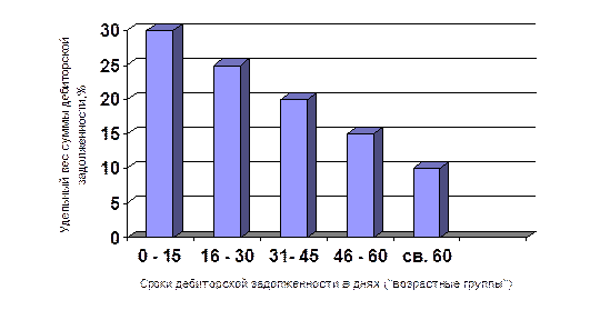 Пример графического представления результатов этой фазы анализа приведен на рисунке 3. Дебиторскую задолженность фирмы по отдельным ее «возрастным группам» можно полнее оценить, сравнивая с предшествующим периодом. Пример такого графического представления результатов анализа приведен в приложении № 4. Рис. 3. Графический анализ реестра «старения» счетов дебиторов [5].