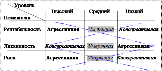 Следующий большой блок проблем, связанных с управлением дебиторской задолженностью – это разработка отдельных параметров кредитной политики предприятия. Понятно, что результаты анализа состояния дебиторской задолженности используются в этом процессе. 1. 3. Разработка кредитной политики фирмы Кредитная политика тесно взаимосвязана с маркетинговой политикой фирмы и ее целью является получение дополнительной прибыли за счет стимулирования продаж. 1. 3. 1. Принципы кредитной политики В процессе формирования принципов кредитной политики необходимо решить стратегический вопрос: каким образом руководству фирмы следует достигать компромисса между риском и ликвидностью своего бизнеса, учитывая влияние на этот выбор периода предоставления кредита, скидок, стандартов кредитоспособности и политики инкассации? Тип кредитной политики неразрывно связан с типом политики управления оборотными активами. Различают три принципиальных типа комплексного управления оборотными активами – консервативный, умеренный и агрессивный. Применительно к кредитной политике фирмы, характерными признаками каждой из стратегий являются: Консервативный тип кредитной политики направлен на минимизацию кредитного риска. Если «консерватизм» считать залогом ликвидности, то при этом типе кредитной политики, фирма существенно повышает ликвидность дебиторской задолженности и не стремится к получению высокой дополнительной прибыли за счет расширения реализации продукции (рентабельность) в кредит. Осуществляя такой тип кредитной политики фирма существенно сокращает круг покупателей товара в кредит за счет групп повышенного риска; минимизирует сроки предоставления кредита и его размера; ужесточает условия предоставления кредита и повышает его стоимость; использует жесткие процедуры инкассации дебиторской задолженности. В результате такого типа управления оборотными активами доля оборотных активов в общих активах сравнительно невелика (менее 40 %), а период их оборачиваемости небольшой – 52 дня [6]. Умеренный тип кредитной политики фирмы характеризует типичные условия ее осуществления в соответствии с принятой коммерческой и финансовой практикой и ориентируется на средний уровень кредитного риска при продаже продукции с отсрочкой платежа. Доля оборотных активов в общих активах – 45 %, продолжительность оборота оборотных средств – 72 дня. Агрессивный (мягкий) тип кредитной политики приоритетной целью ставит повышение рентабельности, т. е. максимизацию дополнительной прибыли за счет расширения объема реализации товара в кредит, не считаясь с высоким уровнем кредитного риска, который сопровождает эти операции. Механизмом реализации политики такого типа является распространение кредита на более рискованные группы покупателей продукции; увеличение периода предоставления кредита и его размера; снижение стоимости кредита до минимально допустимых размеров; предоставление покупателям возможности пролонгирования кредита. В результате такого типа управления оборотными активами доля оборотных активов в общих активах – более 50 % продолжительность оборота оборотных средств – 95 дней. При принятии решения о типе кредитной деятельности фирмы стратегические направления в области кредитной политики можно выявить с помощью матричного метода, 
