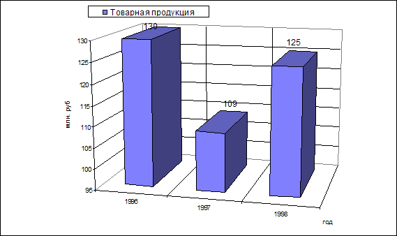 На территории России расположен ряд предприятий по производству химических волокон и нитей. Предприятия отрасли сосредоточены в пяти экономических районах, при этом в Европейской части России находится 60% мощностей, а остальные 40% размещены в Сибири. По производственным мощностям несомненный лидер "Балаковские химволокна", более половины мощностей которого приходится на вискозное волокно. Второе место занимает "Сибволокно". На третьем месте ОАО "Курскхимволокно", которое специализируется в последнее время на выпуске капроновых нитей и волокон. За три последних года, только в 1998 году в отрасли отмечен рост производства по синтетическим нитям, капроновой кордной ткани, капроновому волокну и т.д. Это связано с тем, что в третьем квартале 1998 года из-за роста курса доллара сократились поставки этих видов волокон и нитей с Украины и Белоруссии. В целом по отрасли структура производства химических волокон и нитей периодически изменяется. Несмотря на то, что доля текстильных кордных и технических пленочных нитей в общем выпуске химических волокон и нитей увеличилась, производство их в натуральном выражении сократилось. По синтетическим волокнам и нитям в целом по отрасли - спад производства. За последнее время все производственные мощности предприятия использовались менее чем на 100 %. Объемы производства в стоимостном выражении наглядно представлены на рисунке 1.