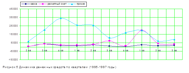 В динамике наблюдается уменьшение оборотных средств и возрастание кредиторской задолженности. Значительный рост задолженности обусловлен обязательствами по договору долгосрочной аренды основных фондов ЗАО "Капрон". Таким образом у предприятия не хватает собственных средств на формирование в полной мере даже внеоборотных активов, не говоря уже за оборотные активы, которые полностью сформированы за счет заемных средств, причем практически за счет только одной кредиторской задолженности. Динамика формирования оборотных средств и кредиторской задолженности имеет негативную тенденцию. Рост кредиторской задолженности ( в основном поставщикам, в бюджет и внебюджетные фонды) объясняется убыточной работой предприятия и отсутствием средств для своевременной оплаты поставок сырья и ресурсов, уплаты налогов. 3.2 Оценка состояния денежных потоков ОАО "Курскхимволокно"В данной главе автор попытается дать комплексную оценку состояния денежных потоков на объекте исследования и разработать рекомендации по улучшению управления денежными потоками. Для этого рассматриваются основные показатели движения денежных средств. Во-первых, необходимо оценить общее состояние денежных средств и проанализировать основные пути их поступления и расходования в исследуемой организации. Для того, чтобы раскрыть реальное движение денежных средств на ОАО "Курскхимволокно", оценить синхронность поступлений и платежей, а также увязать величину полученного финансового результата с состоянием денежных средств, выделим и проанализируем все направления поступления денежных средств, а также их расходования. Общее движение денежных средств представлено в Приложении 3. Представим на графике изменение денежных средств по наиболее важным для анализа статьям за период 1995-1998гг. (рис. 5). Данные Приложения 3 дают общее представление о движении денежных средств по годам в разрезе кварталов. Можно сказать, что остатки на конец квартала денежных средств в кассе нестабильны и изменяются на протяжении рассматриваемого периода. Возможно, это обусловлено тем, что предприятия должны согласовывать с банком, в котором находится его расчетный счет, размер кассового лимита, то есть