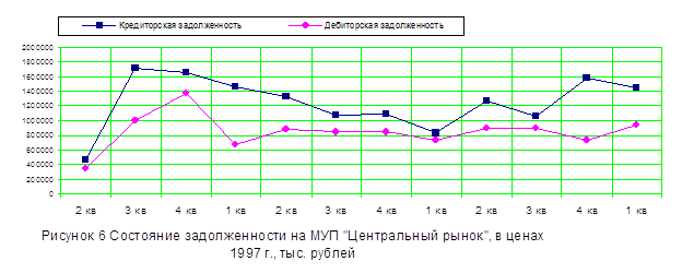 максимально возможные суммы денежных средств находящейся в кассе. К тому же хранить наличные деньги в кассе весьма опасно, да и так как Центральный рынок -предприятие торговли, то выручку оно сдает (инкассирует) в банк. Что касается денежных средств на расчетном счете, то для детального анализа их расходования необходимо просмотреть банковские выписки за соответствующие периоды. О динамике остатков средств на расчетном счете можно сказать, что она вполне соответствует профилю предприятия. Для денежных средств на прочих (специальных) счетах в банке характерна тенденция в сторону их уменьшения. Большое внимание следует уделить динамике изменения кредиторской и дебиторской задолженности. Тенденции изменения кредиторской и дебиторской задолженности в 1995-1998гг. на МУП "Центральный рынок" приведены на графике (рис.6).