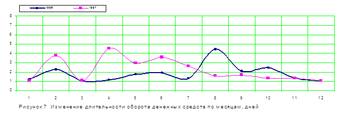 В таблице 7 приведены расчетные данные основных показателей состояния денежных средств, а также прогнозные данные на два периода 1 и 2 кварталы 1998г. Прогноз был сделан в табличном процессоре Excel-97, в нем же были построены приведенные графики. По этим данным можно сделать следующие выводы (рекомендации): 1.