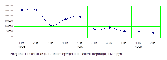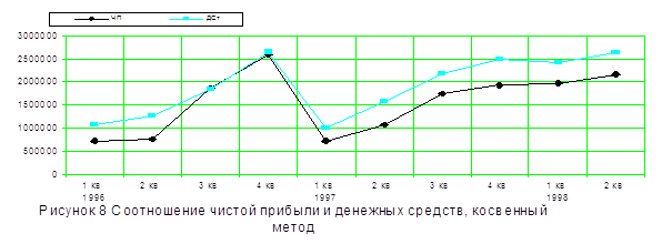 3. Как видно из таблицы 7 и из рис. 9 организация в каждом периоде имела чистую прибыль. С начала 1997г. и, включая прогнозные значения, показатель чистой прибыли имеет тенденцию к возрастанию и довольно стабильно. Размер денежных средств, которыми организация располагала и будет располагать прогнозируется в 1998г. выше, чем показатель прибыли в связи с расхождениями между получением реальных денег и формированием финансовых результатов.