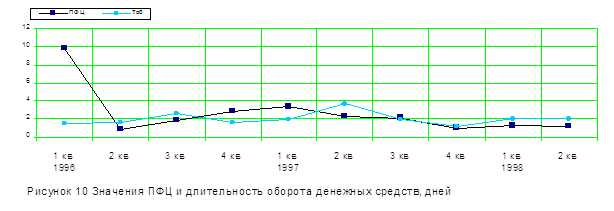 Таким образом, по данным анализа можно сделать следующие выводы: 1. За период существования МУП "Центральный рынок" (с апреля 1995г.) в целом за каждый год преобладал приток денежных средств над оттоком. 2. Доля поступлений от реализации продукции, оказания услуг составляла соответственно 60,0%, 53,9% и 57,4% за 1995-1997гг. Для поддержания такой тенденции нужно стремиться быстрее превращать дебиторскую задолженность, (которая по годам равна в процентах от выручки от реализации соответственно 10,8%, 9,6%, 9,1%) в денежные средства. Видно, что доля дебиторской задолженности в выручке снижается, хотя для многих организаций и предприятий тенденция обратная. 3. Денежные средства направляются в основном на оплату товаров. Доля таких расходов составляет по годам 49,1%, 37,3%, 37,9%. Если к этим расходам прибавить расходы на оплату труда (получится 51,9%, 41,9%, 43,1%), то выручки от реализации продукции вполне хватит, чтобы их произвести. Это говорит о нормальной работе организации. 4. Негативным моментом является недостаточность финансовых вложений предприятия. Эти вложения (в ценные бумаги, срочные депозиты) могли бы приносить доход. Однако, несмотря на преобладание в целом за период притока денежных средств над оттоком, в некоторые периоды у предприятия не хватало средств, чтобы рассчитаться с кредиторами. Об этом говорят данные о коэффициенте абсолютной ликвидности, которые автор будет анализировать далее. 3.3 Анализ основных показателей движения денежных потоковВажным моментом в анализе денежных потоков является определение продолжительности финансового цикла (ПФЦ) (времени обращения денежных средств). Сокращение ПФЦ рассматривается как положительная тенденция, то есть чем меньше ПФЦ, тем денежные средства меньше находятся "замороженными" в различных активах, что способствует ускорению их оборачиваемости и тем самым возможности получения дополнительного дохода. На основе формулы расчета ПФЦ (см. (6)) определим ПФЦ за ряд периодов на МУП "Центральный рынок" (см. Приложение Г). Полученные данные дают представление о ПФЦ, которая увеличивается в первом квартале каждого рассматриваемого года. Увеличение ПФЦ в 1 квартале 1995-1997гг. было обусловлено увеличением времени обращения дебиторской задолженности соответственно на 8.11, 14 и 3.42 дня. Это говорит о том, что произошло замедление оборачиваемости дебиторской задолженности по сравнению с другими периодами, что вызвало, в свою очередь, увеличение доли просроченной и сомнительной дебиторской задолженности, ухудшения ее качества. В дальнейшем ПФЦ снижалась, и как показывают данные, колебалась в диапазоне от 0.88 до 2.7 дня, то есть имеет примерно одинаковый интервал времени. На это влияет снижение времени обращения запасов. Чем меньше время обращения запасов, тем меньше срок их хранения, то есть они не накапливаются и не происходит их затоваривание. Это говорит о том, что на Центральном рынке за счет такого состояния запасов не происходит оттока денежных средств, а значит денежные средства не отвлечены из оборота и могут быть использованы на другие цели. Сокращение ПФЦ было обусловлено также замедлением времени обращения кредиторской задолженности, то есть за счет временно привлеченных средств, которые являются вполне приемлемым источником финансирования в отличии от дорогостоящих кредитов банка. В 1 квартале 1998г. так