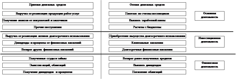 На основе формулы (5) в дальнейшем можно оценить характер кредитной политики предприятия, эквивалентность дебиторской и кредиторской задолженности, специфическую для конкретного предприятия продолжительность операционного цикла и его влияние на величину оборотного капитала предприятия в целом, период отвлечения из хозяйственного оборота денежных средств. Таким образом, центральным моментом в расчете времени обращения денежных средств является продолжительность финансового цикла (ПФЦ). Финансовый цикл - интервал времени с момента приобретения производственных ресурсов до момента поступления денежных средств за реализованный товар. Расчет ПФЦ позволяет указать пути ускорения оборачиваемости денежных средств путем оценивания влияния показателей, используемых при определении ПФЦ. 2.2 Анализ движения потоков денежных средствОдним из главных условий нормальной деятельности предприятия является обеспеченность денежными средствами, оценить которую позволяет анализ денежных потоков. Основная задача анализа денежных потоков заключается в выявлении причин недостатка (избытка) денежных средств, определении источников их поступлений и направлений использования. Цель анализа – выделить, по возможности, все операции, затрагивающие движение денежных средств. При анализе потоки денежных средств рассматриваются по трем видам деятельности: основная, инвестиционная и финансовая. Такое деление позволяет определить, каков удельный вес доходов, полученных от каждой из видов деятельности. Подобный анализ помогает оценить перспективы деятельности предприятия. Основная деятельность - это деятельность предприятия, приносящая ему основные доходы, а также прочие виды деятельности, не связанные с инвестициями и финансами [10, с.40]. Ниже приведены основные направления притока и оттока денежных средств (табл. 1). Таблица 1 Основные направления притока и оттока денежных средств по основной деятельности