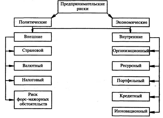 Рис. 3.1 Упрощенная схема предпринимательских рисков Рассмотрим некоторые из приведенных в схеме внешних рисков. Страновые риски1 это риски, которые непосредственно связаны с интернационализацией предпринимательской деятельности. Они актуальны для всех участников внешнеэкономической деятельности и зависят от политико-экономической стабильности стран — импортеров, экспортеров. Причинами странового риска могут быть нестабильность государственной власти, особенности государственного устройства и законодательства, неэффективная экономическая политика, проводимая правительством, этнические и региональные проблемы, резкая поляризация интересов различных социальных групп и т.п. На результаты предпринимательской деятельности могут оказывать влияние, проводимое государством торговое и валютное регулирование, квотирование, лицензирование, изменение таможенных пошлин и т.п. Валютные риски связаны с изменением валютных курсов. Величина валютного риска связана с потерей покупательной способности валюты, поэтому она находится в прямой зависимости от разрыва во времени между сроком заключения сделки и моментом платежа. Курсовые потери у экспортера возникают в случае заключения контракта до падения курса валюты платежа, потому что за вырученные средства экспортер получает меньше национальных денежных средств. Импортер же имеет убытки при повышении курса валюты, т.к. для ее приобретения потребуется затратить больше национальных валютных средств. Валютные риски относятся к спекулятивным рискам, поэтому при потерях одной из сторон в результате изменения валютных курсов другая сторона, как правило, получает дополнительную прибыль, и наоборот. Налоговые риски можно рассматривать с двух позиций – предпринимателя и государства. Налоговый риск предпринимателя связан с возможными изменениями налоговой политики (появление новых налогов, ликвидация или сокращение налоговых льгот и т.п.), а также изменением величины налоговых ставок. Следует отметить, что уровень предпринимательского риска: увеличивают не только высокие ставки налогов, но и нестабильность налогового законодательства, когда существует высокая вероятность того, что ставки налогов могут быть изменены, как правило, в строну увеличения. Постоянно вносимые поправки и дополнения являются источником риска, лишают предпринимателей уверенности в надежности своей деятельности. Налоговый риск государства состоит в возможном сокращении поступлений в бюджет в результате изменения налоговой политики и/или величины налоговых ставок. Как показала практика, государство оказывается заинтересованным в установлении таких ставок налогообложения, которые бы: