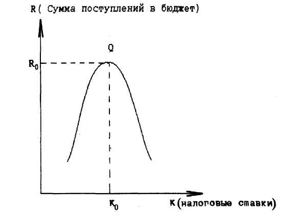 Простейшим примером, иллюстрирующим зависимость поступлений в бюджет от величины ставок налогообложения, является кривая Лаффера1 (рис. 3.2). Данная кривая наглядно показывает, что по мере роста налоговых ставок (К) общая сумма поступлений в бюджет (R) растет. При этом значению ставки Ко соответствует максимальный объем финансовых средств, отчисляемых в виде налогов в бюджет Ro = Q. После прохождения значения Q= f (Ko) последующее увеличение ставок К ведет не к росту налоговых поступлений, а к их сокращению.
