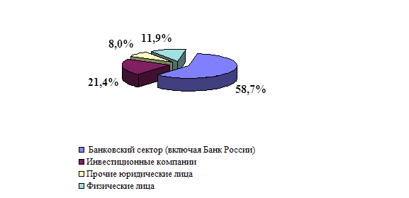 Политика Банка в области привлечения будет направлена на сохранение лидирующего положения на рынке вкладов физических лиц. Сбережения населения по-прежнему будут являться основой ресурсной базы. В числе приоритетов процентной политики будет увеличение доли долгосрочных депозитов. Реализация такой процентной политики позволит Банку существенно сократить процентный и валютный риски. Оптимизируя структуру вкладов по срокам привлечения, Банк будет учитывать риск возможности безусловного досрочного отзыва депозита вкладчиком, что предусмотрено Гражданским Кодексом. С целью улучшения структуры привлеченных ресурсов и предоставления конкурентоспособных ценовых условий для инвестиций в реальный сектор экономики, Банк ставит одной из основных задач в области привлечения средств сохранение и увеличение доли на рынке банковского обслуживания корпоративных клиентов. Что также будет способствовать снижению процентного риска и повышению объемов непроцентных доходов Банка. Банк продолжит практику привлечения средств физических и юридических лиц путем эмиссии долговых обязательств и выпуска банковских сертификатов и предполагает сохранить долю данного вида ресурсов на уровне 6-7% от объема привлеченных Банком средств. Банк планирует сохранить долю этих инструментов привлечения на постоянном уровне для диверсификации ресурсной базы, будет повышать их привлекательность как средства накопления и расчетов. Роль лидера банковской системы России, высокие показатели ликвидности и надежности дают Банку конкурентные преимущества в работе на межбанковском рынке и позволяют использовать инструменты привлечения средств с целью обеспечения краткосрочной ликвидности, удешевления финансирования текущих платежей, более эффективного использования остатков на счетах Банка. Заимствования среднесрочных и долгосрочных ресурсов у коммерческих банков как существенные источники формирования ресурсной базы Банка не рассматриваются. Размещение Для достижения основных стратегических целей Банк будет поддерживать оптимальное соотношение между тремя основными направлениями деятельности в области размещения ресурсов: · Кредитование физических лиц - перспективный сегмент рынка размещения ресурсов. · Кредитование, проектное финансирование и вложения в долговые ценные бумаги юридических лиц - главное направление размещения ресурсов, содействующее развитию национальной экономики, поддержке отечественного производителя товаров и услуг. · Инвестиции в государственные ценные бумаги, кредитование и участие в реализации целевых государственных и региональных проектов — основная форма поддержки экономических программ государства. В рамках стратегии в области управления рисками при формировании активов Банк будет стремиться к поддержанию достаточного уровня ликвидности, сбалансированности структуры активов и пассивов Банка по срокам и видам валют, обеспечению необходимого уровня диверсификации по регионам, отраслям, клиентам и размерам инвестиций. Развитие активных операций Банка будет осуществляться с учетом оценки эффективности различных сегментов рынка. Рис.4 Структура размещенных ресурсов на 01.01.2000 г.