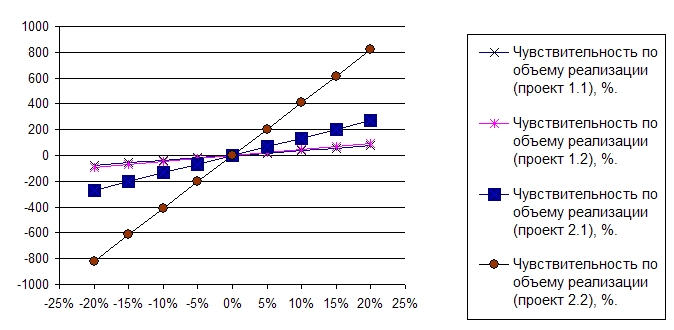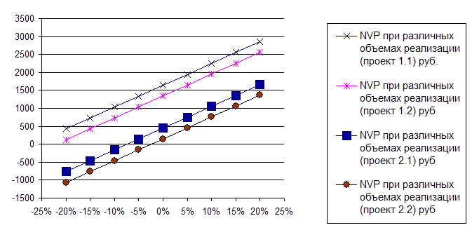 Рисунок. 2.2 - Динамика чистого приведенного дохода при вариации величины товарооборота Чистый приведенный доход изменяется прямо пропорционально выручке и обратно пропорционально ставке дисконтирования. Наибольший чистый приведенный доход через три года предприятие получит при применении проекта 1.1, наименьший - проекта 2.2, Таблица 2.5 - Чувствительность по варьируемым параметрам