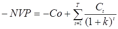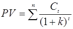 где Т1 - число лет до смены знака накопленных потоков. Ограничения в использовании метода: - не учитывается временная стоимость денег и степень неопределенности будущих чистых денежных потоков; - не учитываются чистые денежные потоки за сроком окупаемости. Из-за этого выбор из альтернативных проектов по методу срока окупаемости может привести к ошибочным результатам. Метод срока окупаемости для дисконтированных денежных потоков Этот метод предполагает расчет срока окупаемости для дисконтированных значений чистых денежных потоков по годам и сравнении его с приемлемым сроком окупаемости. Недостатком данного метода является то, что игнаризуются денежные потоки за сроком окупаемости. Для сравнения проектов должен быть установлен приемлемый срок окупаемости. Для стандартного чистого денежного потока возможно установление приемлемого срока окупаемости (по Гордону), который максимизирует значение чистого дисконтированного дохода по проекту (NPV): Т” = 1\k - 1 \ (k) (1 + k)n , (1.4) где k - стоимость капитала проекта; n - Число лет функционирования проекта. Этот оптимальный срок может рассматриваться в качестве сравнительного при отборе приемлемых проектов. По рассматриваемому проекту рассчитывают срок окупаемости и сравнивают с оптимальным сроком Гордона. 2) Метод чистого дисконтированного дохода Метод исходит из сравнения инвестиционных затрат с текущей оценкой всех будущих чистых денежных потоков по годам функционирования проекта. Правило метода чистого дисконтированного дохода (NPV): если текущая оценка будущих чистых денежных потоков превышает текущую оценку инвестиционных затрат, то проект принимается. Чистый дисконтированный доход равен разнице текущей оценки отдачи и текущей оценки инвестиционных затрат. Проект принимается, если NPV положителен. Расчет значения NPV предполагает: - прогноз по каждому году функционирования проекта чистого денежного потока; - обоснование ставки дисконтирования, которая обеспечит приведение будущих потоков по годам к текущему моменту времени (моменту осуществления инвестиций). Ставка дисконтирования должна отражать временную стоимость денег, инфляционные ожидания и риск инвестирования в данный проект рассчитывается по формуле (1.5):