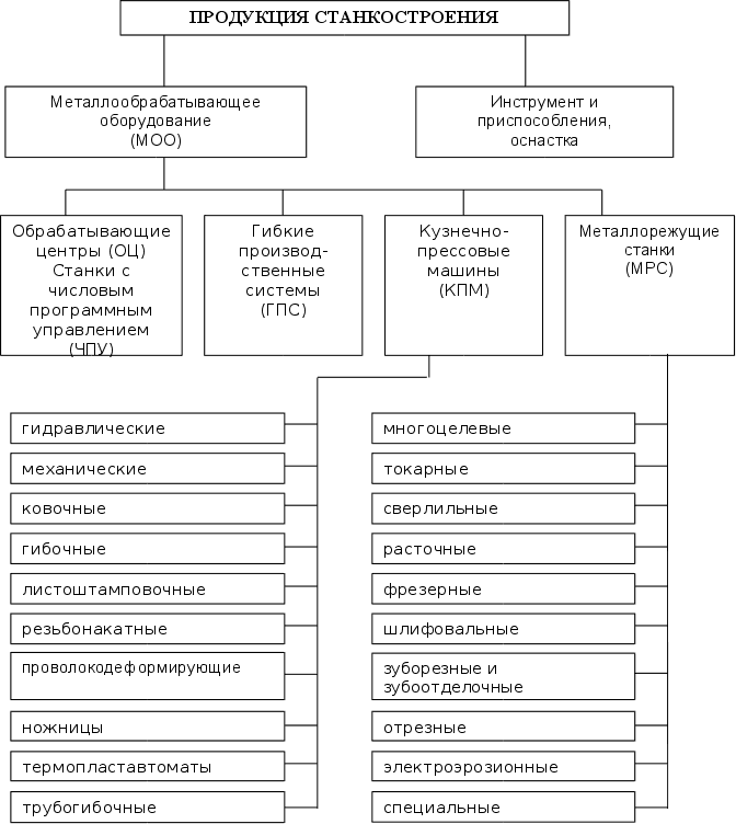 Формирование рыночных отношений характеризуется снижением серийности выпуска продукции, расширением конкуренции среди производителей. Это требует постоянного совершенствования конструкций, повышения технического уровня и качества продукции, структурной перестройки производства, расширения номенклатуры выпуска, сокращения сроков выполнения заказов, удовлетворения запросов конкретного потребителя, сокращения собственных затрат на производство. В этой связи необходимо развивать фирменные услуги, обеспечение комплексных поставок оборудования, поставок потребителям законченных технологий (11, с.42). В обобщенном виде номенклатура станкоинструментальной отрасли представлена на рисунке 1.1. В настоящее время из 77% всех металлорежущих станков до 26% находятся в автомобилестроении, около 10% - в электротехнической промышленности и 41% - в других отраслях машиностроительного комплекса. В перспективе структура выпуска оборудования в станкостроении будет определяться темпами внедрения новых видов материалов и освоением современных прогрессивных технологических процессов в машиностроении. Политика ресурсосбережения в период до 2010 г. будет строиться по следующим основным направлениям:
