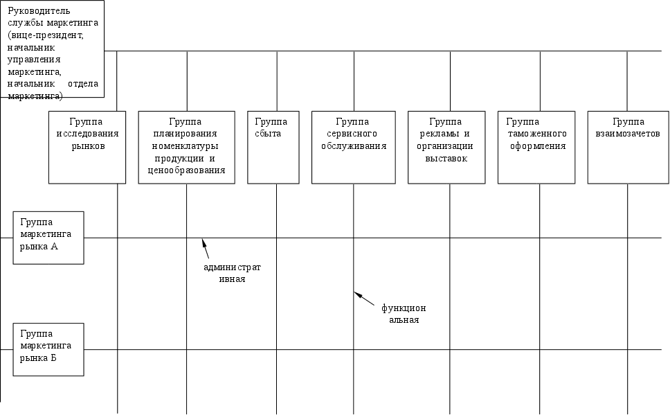 Главным образом, эти проблемы связаны с отсутствием рыночного менталитета и опыта работы в рыночных условиях у руководителей и работников предприятий. По сути в нынешних условиях служба маркетинга на предприятиях помогает отделу сбыта продавать уже произведённую продукцию. Эта помощь выражается в рекламной поддержке сбыта, изучении рынка в целях его сегментации по потребителям и регионам, а также выработке предложений по улучшению продаж. По мере насыщения рынка предприятия начинают активно использовать стимулирующие мероприятия, но направляют их в основном на потребителей, упуская из виду необходимость стимулирования продавцов продукции. ОАО «ОЗРСС», в целях приближения к российским потребителям организовало свои представительства в Москве и Екатеринбурге и уже приступает к созданию дилерской сети в странах СНГ, а также укрепляет традиционно крепкие отношения с представительствами ВО АО «Станкоимпорт» в дальнем зарубежье. Такая концепция, направленная на сохранение традиционных рынков сбыта и завоевание новых, потребовала реорганизацию службы сбыта и маркетинга. Вновь созданная маркетинговая служба представляет собой доработку известной схемы рыночно-функциональной организации службы маркетинга (рис. 3.4). Такая же схема используется на ОАО «Рязанский станкостроительный завод».