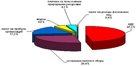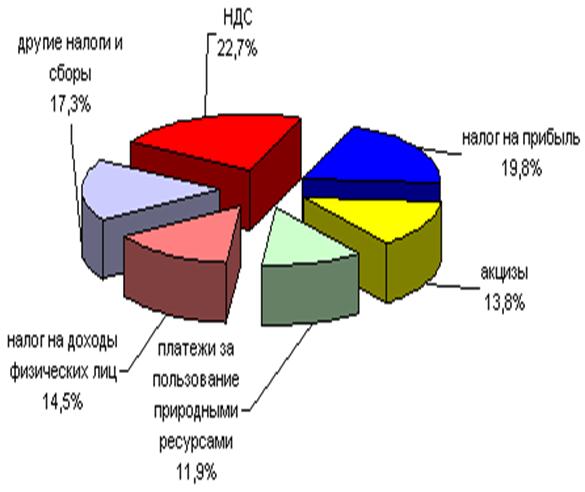январе-марте 2002 года (в %) Если по итогам 2 месяцев 2002 года было выявлено изменение структуры поступлений налогов и сборов устоявшейся за предыдущий год: увеличение поступлений по Центральному, Южному, Приволжскому и Дальневосточному федеральным округам и снижение поступлений по Северо-Западному федеральному округу и, в наибольшей степени, Уральскому федеральному округу, то по итогам квартала структура поступлений в окружном разрезе приняла прежний вид. Доля участия Приволжского и Уральского федеральных округов в формировании налоговых доходов федерального бюджета также выше, чем консолидированного на 0,2 и 0,8 процентного пункта соответственно. По Северо-Западному, Дальневосточному, Южному и Сибирскому федеральным округам долевое участие в формировании консолидированного бюджета больше по сравнению с федеральным на 1,7; 1,3; 0,7; 0,6 процентных пункта соответственно. Налоговые поступления в консолидированный бюджет формируются за счет поступлений по федеральным, региональным и местным налогам. При этом поступления по федеральным налогам в консолидированный бюджет составляют 87,3%, из которых на НДС приходится 22,7%, налог на прибыль - 19,8%, налог на доходы физических лиц - 14,5%, акцизы - 13,8%, платежи за пользование природными ресурсами - 11,9 процента. В марте в федеральный бюджет поступило налогов и сборов на сумму 91,2 млрд. рублей, или 123,1% к аналогичному периоду прошлого года, а за январь-март 2002 года поступления составили 242,1 млрд. рублей (51,8% к общему объему поступлений), что на 20,8% больше, чем в соответствующем периоде прошлого года. Структурный состав налоговых доходов федерального бюджета несколько отличается от консолидированного. Так, основная масса налоговых поступлений федерального бюджета в марте обеспечена поступлениями НДС (45,6%), акцизов (18,9%), налога на прибыль организаций (16,2%), платежей за пользование природными ресурсами (15,6%). Поступление налога на добавленную стоимость в бюджетную систему Российской Федерации в марте 2002 года составило 41,6 млрд.рублей, а за 3 месяца 2002 года - 106,2 млрд. рублей, или 107,2% к соответствующему периоду 2001 года. В консолидированный бюджет в марте 2002 года поступило акцизов по сводной группе подакцизных товаров на сумму 20,8 млрд.рублей. За январь-март поступления составили 64,6 млрд.рублей, увеличившись на 33,8% по сравнению с соответствующим периодом 2001 года. В федеральный бюджет в марте мобилизовано акцизов на сумму 17,2 млрд.рублей, а за январь-март общая сумма поступлений в федеральный бюджет составила 54,2 млрд. рублей, что на 34,4 процента превышает уровень поступлений января-марта 2001 года. Поступления платежей за пользование природными ресурсами в консолидированный бюджет составили в марте 22,8 млрд.рублей, за январь-март 2002 года - 55,5 млрд. рублей, увеличившись по сравнению с аналогичным периодом 2001 года на 90,4%. В марте в федеральный бюджет поступило платежей за пользование природными ресурсами на сумму 14,2 млрд.рублей. При этом за 3 месяца 2002 года в федеральный бюджет мобилизовано 31,8 млрд. рублей, что более чем в 3,4 раза больше, чем в январе-марте 2001 года. В общей сумме платежей за пользование природными ресурсами в консолидированный бюджет поступления налога на добычу полезных ископаемых, введенного с января т.г. взамен трех налогов, уплачиваемых ранее, составили в январе-марте 37,4 млрд.рублей, увеличившись з