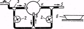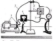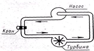 рис.5. Когда установка собрана целиком (см. рис. 2), обращают внимание на показания манометра, который аналогичен вольтметру в электрической цепи. Одновременно демонстрируют величины, аналогичные электродвижущей силе и напряжению. Действительно, если открыть кран 6, а кран 7 закрыть, то циркуляции воды не будет, и манометр покажет максимальную разность давлений при таком числе оборотов. Это показание манометра аналогично электродвижущей силе. Если же кран 7 открыть, то вследствие движения воды турбина приходит в движение и показания манометра уменьшаются. (Показания манометра аналогичны напряжению, а показания расходомера — току.) Изменяя сопротивление трубок (набор трубок различного поперечного сечения и длины) движению воды, показывают зависимость между напором и сопротивлением движению воды, которая аналогична закону Ома для полной цепи.