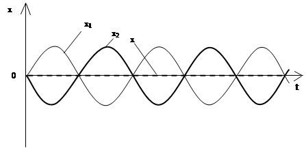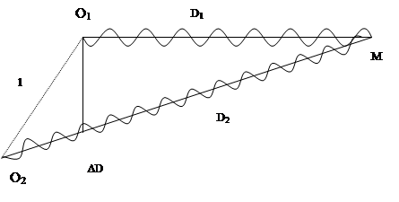 Рис.1. В любой точке М на поверхности воды будут складываться колебания, вызванные двумя волнами (от источников O1 и О2). Амплитуды колебаний вызванных в т.М будут отличаться друг от друга, так как волны проходят различные пути D1 и D2 . Но если расстояние l между источниками много меньше этих путей (l <<D1и l<<D2), то обе амплитуды можно считать одинаковыми. Результат сложения волн в точке М зависит от разности фаз между ними. Пройдя различные расстояния, волны имеют разность хода ΔD=D2-D1 Если разность хода равна длине волны l, то вторая волна запаздывает по сравнению с первой ровно на один период. Следовательно, в этом случае гребни (впадины) обеих волн совпадают. Сложение волн в зависимости от разности их хода объясняют на специально вычерченных графиках, показывая, как складываются колебания при условии совпадения фаз и в случае когда колебания происходят в противофазе. Зависимость от времени смещения х1 и х2 вызванных двумя волнами при DD=l. Разность фаз колебаний равна нулю, так как период синуса равен 2p (рис.2).