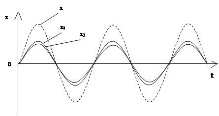 Рис. 2 В результате сложения этих колебаний возникает результирующее колебание с удвоенной амплитудой. Колебания результирующего смещения x показаны пунктиром. То же самое будет происходить, если на отрезке DD укладывается не одна, а любое целое число длин волн: DD=kl, k=0, 1, 2…. – условие максимума. Пусть теперь на отрезке DD укладывается половина длины волны (рис.3).