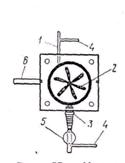 рис.3. Вода в нее поступает через сопло 1 вверху турбины, приводит в движение ротор 2 и выходит через отверстие 3. Ось ротора установлена в подшипниках и вращается с малым трением. При увеличении числа оборотов двигателя увеличивается напор воды и ротор турбины вращается быстрее. К турбине присоединяют манометр через специальные трубки 4, имеется кран 5. Сбоку турбины укреплен металлический стержень 6, с помощью которого ее устанавливают на лабораторном штативе. Для герметичности турбины между корпусом и крышкой поставлена резиновая прокладка. В расходомере (изготовленном из плексигласа) имеется канал, по которому протекает вода, приведенная в движение насосом. В канале перпендикулярно дв ижущемуся потоку расположена площадка, соединенная со стрелкой расходомера. Укрепляют расходомер на специальном штативе с помощью вертикального стержня. С другими приборами он соединен резиновыми трубками. Вверху расходомера имеется отверстие, закрепленное винтом, необходимым для выпуска воздуха при заполнении системы водой. Демонстрации с установкой сводятся к следующему. Когда установка состоит из насоса и трубки (рис.4) демонстрируют циркуляцию воды, аналогичную движению зарядов в электрической цепи.