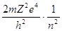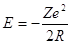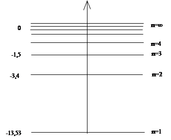 V=nh/2πmR; n2h2/4π2mR3=Ze2/R2 R=n2h2/Ze24π2m E=- Полную энергию атома при определенном стационарном состояии называют энергетическим уровнем. Вычисляя значения E при n=1, E при n=2 и т. д., получаем ряд значений энергии: Е1=-13,53 эВ; Е2=-3,4 эВ; Е3=-1,5 эВ; Е4=-0,8 эВ и т.п.