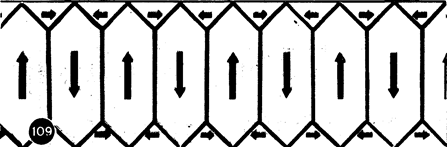 Рис.7. Тепловое движение приводит спины атомов в беспорядочное расположение, и парамагнитные свойства вещества обычно не проявляются (рис. 7 слева). Но если поместить такое вещество во внешнее магнитное поле, то спины атомов в результате прецессии ориентируются приблизительно вдоль линий индукции внешнего магнитного поля (как гироскоп вдоль меридиана) и вещество проявляет свойства парамагнетика (рис. 7 справа). Особую группу составляет небольшой класс веществ — ферромагнетики, названные по их главному представителю — железу. По современной теории кристалл железа состоит из отдельных микроскопических областей (доменов), в каждой из которых спины атомов уже расположены (без участия внешнего поля) в направлении кристаллических осей (вспомните анизотропию кристаллов). В ненамагниченном железе домены ориентированы так, что суммарное магнитное поле их равно нулю (рис. 8).