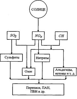 Формирование смога и образование оксиданта обычно останавливается при прекращении солнечной радиации в темное время суток и дисперсии реагентов и продуктов реакции. В Москве при обычных условиях концентрация тропосферного озона, который является предвестником образования фотохимического смога, достаточно низкая. Оценки показывают, что генерация озона из оксидов азота и углеводородных соединений вследствие переноса воздушных масс и повышение его концентрации, и следовательно, неблагоприятное воздействие происходит на расстоянии 300-500 км от Москвы (в районе Нижнего Новгорода). 2.3 Влияние вредных веществ на организмПомимо метеорологических факторов самоочищения атмосферы некоторые компоненты вредных выбросов автомобильного транспорта участвуют в процессах взаимодействия с компонентами воздушной среды, результатом которых является возникновение новых вредных веществ (вторичные атмосферные загрязнители). Загрязнители вступают с компонентами атмосферного воздуха в физическое, химическое и фотохимическое взаимодействия. Многообразие продуктов выхлопов автомобильных двигателей может быть классифицировано по группам, сходным по характеру воздействия на организмы или химической структуре и свойствам: 1) нетоксичные вещества: азот, кислород, водород, водяной пар и углекислый газ, содержание которых в атмосфере в обычных условиях не достигает уровня, вредного для человека; 2) моноксид углерода, наличие которого характерно для выхлопов бензиновых двигателей; 3) оксиды азота (~ 98% NО,~ 2% NO2), которые по мере пребывания в атмосфере соединяются с кислородом; 4) углеводороды (алкаин, алкены, алкадиены, цикланы, ароматические соединения); 5) альдегиды; 6) сажа; 7) соединения свинца. 8) серистый ангидрид. Чувствительность населения к действию загрязнения атмосферы зависит от большого числа факторов, в том числе от возраста, пола, общего состояния здоровья, питания, температуры и влажности и т.д. Лица пожилого возраста, дети, больные, курильщики, страдающие хроническим бронхитом, коронарной недостаточностью, астмой, являются более уязвимыми. Общая схема реакции организма на воздействие загрязнителей ОС по данным Всемирной организации здравоохранения (ВОЗ) имеет следующий вид