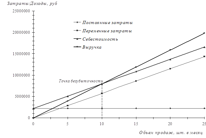 8 ФИНАНСОВЫЙ ПЛАН 8.1 пЛАН ДОХОДОВ И РАСХОДОВПлан доходов и расходов на первый год проекта оформляем в виде таблицы 15. 8.2 определение точки безубыточностиТочка безубыточности может быть определена двумя способами - графическим и аналитическим. Для начала разделим все затраты на постоянные и переменные - таб. 14: Таблица 14