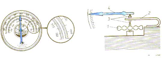 ртути). Внешний вид анероида изображен на рисунке. Главная часть его - металлическая коробочка 1 с волнистой (гофрированной) поверхностью. Из этой коробочки выкачан воздух, а чтобы атмосферное давление не раздавило коробочку, ее крышку пружиной 2 оттягивают вверх. При увеличении атмосферного давления крышка прогибается вниз и натягивает пружину. При уменьшении давления пружина выпрямляет крышку. К пружине с помощью передаточного механизма 3 прикреплена стрелка-указатель 4, которая передвигается вправо или влево при изменении давления. Под стрелкой укреплена шкала, деления которой нанесены по показаниям ртутного барометра. Так, число 750, против которого стоит стрелка анероида , показывает, что в данный момент в ртутном барометре высота ртутного столба 750 мм. -4-