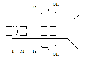 Рис. 2. Обозначение осциллографической электронно-лучевой трубки Рассмотрим ее устройство. Катод К представляет собой, как обычно, полый цилиндр, но с одним донышком. Оксидный слой нанесен только на это донышко, которым катод обращен внутри трубки. Далее установлен управляющий электрод или модулятор М, который выполнен в виде цилиндра с донышком, в котором имеется отверстие. На модулятор подается отрицательное напряжение относительно катода, которым отталкиваются к оси трубки электроны, вылетающие из катода под углом. Через отверстие в донышке модулятора походят лишь те электроны, которые находятся на оси. Модулятор также выполняет функции управляющей сетки: с увеличением отрицательного напряжения интенсивность выходящего из отверстия электронного потока уменьшается и при определенном отрицательном напряжении полностью прекращаются. Такое напряжение называется запирающим. За модулятором установлен первый анод 1а, который подается относительно катода положительное напряжение. Конфигурация электрического поля в пространстве между модулятором и первым анодом имеет форму линзы. Этим полем осуществляется фокусировка электронного пучка, благодаря которой он приобретает форму спицы. Первый анод выполнен в виде полого цилиндра модулятора диаметром больше, чем диаметр цилиндра модулятора. Изменяя напряжение на первом аноде, можно осуществлять фокусировку электронного пучка. Далее следует второй анод 2а, который является ускоряющим электродом. Он также выполнен в виде полого цилиндра. Основная часть электронов в пучке, разогнавшись до большой скорости, не попадает на стенки второго анода, а пролетает по его оси. На второй анод подается высокое напряжение, необходимое для придания электронам в пучке большой скорости. Комплект перечисленных электродов трубки (катод с подогревателем, модулятор, первый и второй аноды) образует электронный прожектор или электронную пушку и выполняется в виде жесткого единого узла, собранного на слюдяных пластиках, с использованием керамических цилиндрических изоляторов. Далее на пути электронного пучка установлены две пары отклоняющих пластин ОП. Средний потенциал отклоняющихся пластин равен потенциалу второго анода и не должен воздействовать на электронный пучок. Но если между пластинами пары имеется напряжение, пучок отклоняется от оси трубки в сторону более положительной пластины. Одна пара пластин расположена вертикально, может отклонять электронный пучок в горизонтальном направлении и называется горизонтально – отклоняющей. Вторая пара пластин расположена горизонтально и называется вертикально – отклоняющей. Пройдя мимо системы отклоняющих пластин, электронный луч попадает на экран Э, покрытый слоем специального вещества, которое называется люминофором. Под воздействием электронной бомбардировки происходит свечение люминофора, наблюдаемое с внешней стороны экрана. В связи с тем, что бомбардировка люминофора, покрытого тонким слоем металла, сопровождается вторичной электронной эмиссией, коническая часть колбы трубки покрыта графитовым слоем (аквадагом) и соединяется со вторым анодом. Вторичные электроны удавливаются аквадагом и образуют ток второго анода. Конструкция отклоняющих катушек. Отклоняющие катушки с ферромагнитными сердечниками позволяют увелич