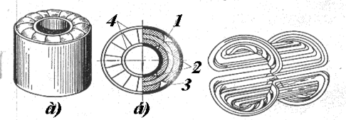 Рис. 4. Магнитная отклоняющая система с внутренним магнитопроводом-а — внешний вид; б — разрез; / — магнитопровод; 2 — катушки горизонтального отклонения; 3 — катушки вертикального отклонения; 4—пластмассовые гильзы Рис. 5. Секционированные отклоняющие катушки Системы с внешним магнитопроводом достаточно экономичны, компактны и при правильно выбранных геометрических соотношениях позволяют получать достаточно большие углы отклонения при сохранении линейности и сравнительно небольшом нарушении фокусировки луча. Системы с инешним магнитопроводом получили широкое распространение как отклоняющие системы кинескопов. Коснтрукция электростатических отклоняющих пластин. Очевидно, максимально возможное отклоняющее действие электостатическое поле будет оказывать на электронный луч тогда, когда во всей области отклонения сила, действующая на электрон, будет перпендикулярна к направлению его оптимальной формы движения. Такая идеальная электростатическая система образуется двумя изогнутыми пластинами, причем на входе луча расстояние между пластинами может быть равным диаметру электронного луча.