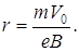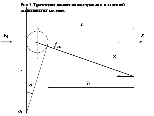 Магнитная отклоняющая система обычно содержит две пары катушек, надеваемых на горловину трубки и образующих магнитные поля во взаимно перпендикулярных направлениях. Рассмотрим отклонение электрона магнитным полем одной пары катушек, считая, что поле ограничено диаметром катушки и в этом пространстве однородно. На рис.1 силовые линии магнитного поля изображены уходящими от зрителя перпендикулярно плоскости чертежа. Электрон с начальной скоростью V0 движется в магнитном поле, вектор индукции B которого нормален к вектору скорости V0, по окружности с радиусом
