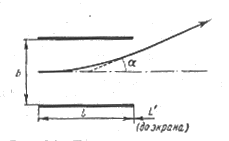 Рис 1.1 Простейшая отклоняющая система 3. Основные характеристики физического эффекта Отклоняющие системы с оптической точки зрения являются электронными призмами. Эффект, аналогичный преломлению светового луча при прохождении сквозь призму, имеет место при прохождении электронного луча в поперечном электрическом или магнитном поле. Основными характеристиками являются: a) Угол отклонения электронного луча-α. Определяется по формулам: