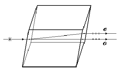 Закон был сформулирован Малюсом в 1810 году и подтвержден тщательными фотометрическими измерениями Араго. Двойное лучепреломление.1. Явление двойного лучепреломления.Фундаментальным свойством световых лучей при их прохождении в кристаллах является двойное лучепреломление, открытое в 1670 году Бартолином и подробно исследованное Гюйгенсом, опубликовавшим в 1690 году свой знаменитый “Трактат о свете, в котором изложены причины того, что происходит при отражении и преломлении и, в частности, при необыкновенном преломлении в кристаллах из Исландии.” Явление двойного лучепреломления объясняется особенностями распространения света в анизотропных средах. Если на кристалл исландского шпата направить узкий пучок света, то из кристалла выйдут два пространственно разделенных луча, параллельных друг другу и падающему лучу.
