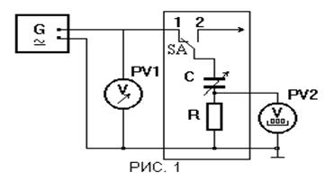 В эксперименте используются следующие приборы: два вольтметра PV1 (стрелочный) и PV2 (цифровой), генератор сигналов низкочастотный, макет-схема, на которой установлен резистор R=120 Ом, конденсатор, состоящий из набора пластин различных диэлектриков (толщиной d=2 мм). Собираем схему, изображенную на РИС. 1. Ставим переключатель SA в положение 1. Подготавливаем к работе и включаем приборы. Подаем с генератора сигнал частоты f=60 кГц и напряжением U=5 В, затем по вольтметру PV1 установить напряжение U1=5 В. Далее, вращая подвижную пластину, измеряем напряжение U2 для конденсатора без диэлектрика и 4-x конденсаторов с диэлектриками одинаковой толщины. При этом напряжение U1 поддерживаем постоянным. Напряженность поля между пластинами в