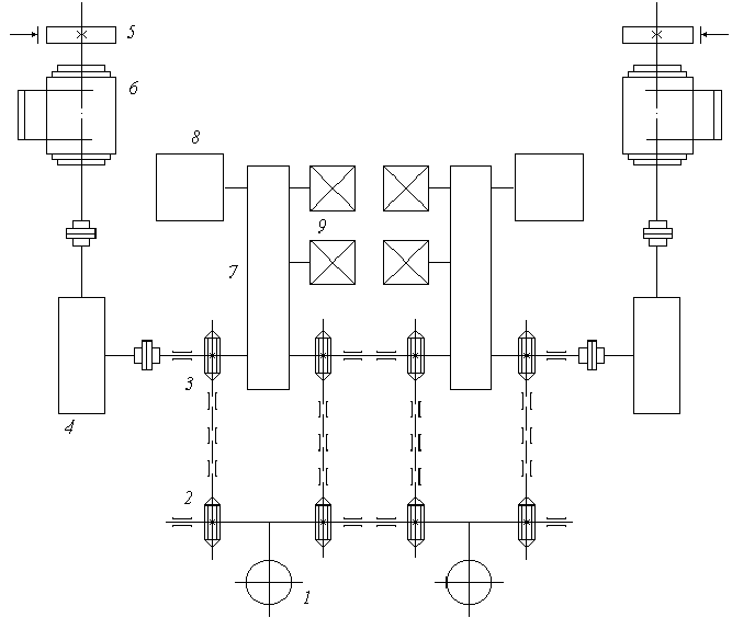 рис. 1.1 На кинематической схеме обозначено: 1 - фурма, 2 - звёздочка обводная (на старых моделях конвертеров применялась цепная передача, сейчас применяется тросовая), 3 - звёздочка приводная, 4 - силовой редуктор, 5 - тормоз, 6 - двигатель, 7 - кинематический редуктор, 8 - командоаппарат, 9 - сельсин. На приводе каждой фурмы установлен двигатель постоянного тока с независимым возбуждением типа ДП-52 (32 кВт, 220 В, 760 об/мин). С приводом связаны многоцепной командоаппарат КАР-46 и два сельсина-датчика БД404А. На рис. 1.2 приведена тахограмма работы заданного привода.