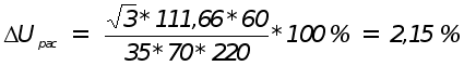 По [7], стр. 22, табл. 1.3.7., выбираем трехжильный кабель с алюминиевыми жилами, пластмассовой изоляцией в свинцовой оболочке, с сечением токопроводящих жил в 70 мм2, для прокладки кабеля в воздухе. Iдоп = 140 А > Iрас = 111,66 А. Проверяем выбранный кабель на падение напряжения на выбранном участке. Uдоп = 5 %.