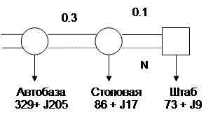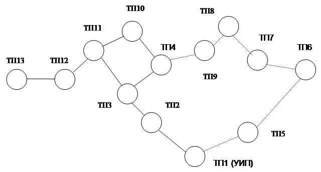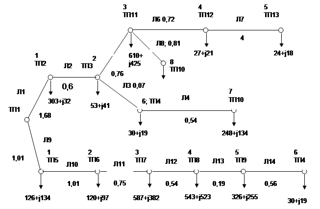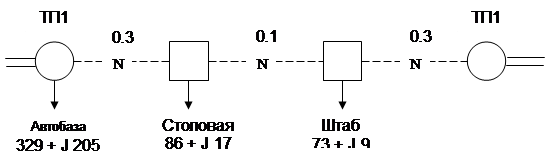 Проверим данную сеть на потери напряжения. В сети 6 кВ они должны быть ΔU=(6–8)%. Потери напряжения находим по формуле ΔU=(∑Рлі*Rлі*li+∑ Qлі*Xлі*li)/U Расчет ведется по наиболее удаленной точке сети и с учетом Код. Самой удаленной точкой линии является ТП13 DU=342 В Это составляет 5,7% и удовлетворяет условию ΔUдоп=6% 12. Расчет низковольтной сети. Этот расчет ведется по допустимой потере напряжения и по минимуму массы проводов. Требования ГОСТ 13109-76 можно удовлетворить, если потери напряжения в отдельных элементах сети не будет превышать некоторых допустимых значений. Петлевая сеть: (штаб, столовая).