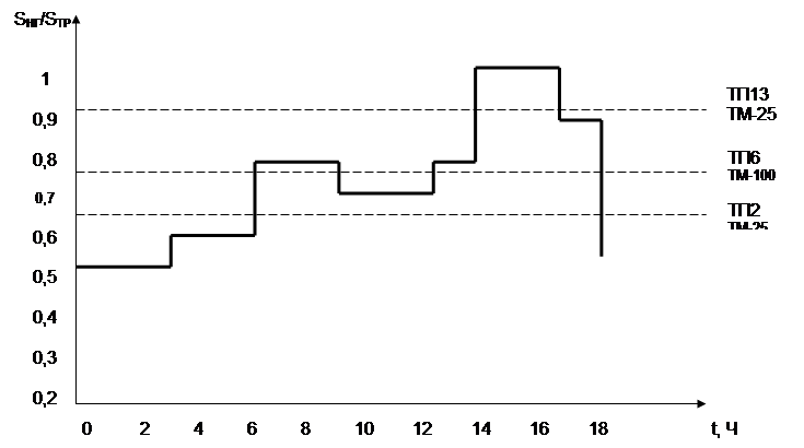 Рисунок 2. 1. Для одно-трансформаторных подстанций выбирать трансформатор с номинальной мощностью больше Sнг.max/1,5 и рассчитать двухступенчатый график нагрузки, период ночной нагрузки Sнг ‹ Sном и период перегрузки Sнг›Sном Рассмотрим пример расчета одно-трансформаторной подстанции для ТП13 (ДПРМ): Sнг.max=28 кВА Выбираем трансформатор с номинальной мощностью Sном.тр › Sнг.max/1,5=28/1,5=19 кВА ‹ Sтр =25кВА Берем ТМ-25