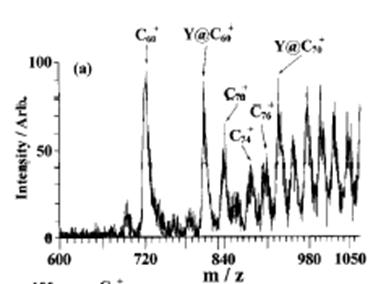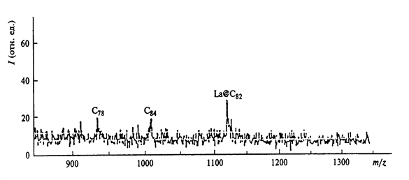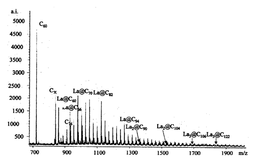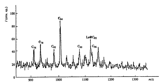Рис. 3. Масс-спектр сероуглеродного экстракта эндофуллеренсодержащей сажи, полученный методом лазерной десорбции на время пролетном масс-спектрометре Таким образом, электродуговой метод синтеза является эффективным способом получения эндометаллофуллеренов в макроколичествах. Однако во всех известных работах, посвященных синтезу эндометаллофуллеренов электродуговым методом, приводятся лишь параметры дуги и конкретные результаты по выходу эндофуллеренов. При этом отсутствует анализа влияния параметров электрической дуги на оптимизацию условий синтеза эндометаллофуллеренов. Другие методы синтеза эндоэдральных фуллереновЭндоэдральные фуллерены могут быть получены также и другими методами: · газовый метод синтеза; · ионная имплантация; · использование реакций ядерного превращения элемента. Полые фуллерены, полученные традиционными методами, при длительном нагревание в присутствии газа при повышенном давлении могут поглощать атомы или молекулы газа, образуя эндоэдральные молекулы [20]. Данный метод использовался для синтеза и исследования эндоэдральных молекул, содержащих атомы инертных газов He, Ne, Ar, Kr, Xe, а также простейшие молекулы CO, CN. Как показали исследования, выполненные в работе [20], при длительной выдержке фуллеренов в атмосфере газа при повышенном давлении и достаточно высокой температуре между полыми и эндоэдральными молекулами фуллеренов устанавливается термодинамическое равновесие. При этом в оптимальных условиях, которые в зависимости от сорта газа соответствуют интервалу температуры 600 – 1000 0С и давлению газа в несколько тысяч атмосфер, равновесное содержание эндоэдральных молекул не превышает десятой доли процента Метод ионной имплантации синтеза эндоэдральных фуллеренов основан на бомбардировке полых фуллеренов ионами того элемента, который должен быть заключен в углеродный каркас молекулы фуллерена. Данный метод незаменим при получении эндоэдральных соединений, содержащих внутри себя атомы элементов повышенной химической активности. Так используя этот метод [21,22], успешно синтезировано соединение N@C60, в котором чрезвычайно высокая активность атомарного азота оказалась практически полностью подавленной, несмотря на наличие неспаренных валентных электронов. Для получения N@C60 производилась бомбардировка пленки фуллерена С60, напыленной на подложку, ионами азота. Затем напыленной материал удаляли с медной подложки, растворяли в толуоле с последующей фильтрацией. Растворимая фракция массой 1-2 мг, представляющая собой С60 с примесью N@C60 на уровне 10-4-10-5, исследовалась методом ЭПР. Еще более экзотичным выглядят методы синтеза эндоэдральных фуллеренов, основанные на использование реакций ядерного превращения. Так эндоэдралы Be@C60 получали в результате проникновения в полость молекулы фуллерена С60 быстрых ядер отдачи 7Be, образующихся в ядерной реакции [23]. Выделение и разделение эндометаллофуллереновЭндометаллофуллерены могут быть выделены из сажи, как сублимацией, так и экстракцией, причем последняя процедура является на данный момент наиболее разработанной, вследствие чего более продуктивной. Процесс экстракции основан на том, что эндофуллерены растворимы в большинстве органических растворителей: толуол, бензол, о-ксилол, сероуглерод и др. Но поскольку процесс растворения очен