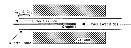 Рис. 2. Схема установки лазерного испарения графита для получения фуллеренов и эндометаллофуллеренов. Синтез эндоэдральных фуллеренов в микроколичествах был впервые осуществлен в работе [14], существенной особенностью, которой было использование в качестве лазерной мишени композитного материала, полученного прессованием La2O3, графитового порошка и смолы. Мишень помещалась в цилиндрическую, заполненную гелием, подогреваемую камеру. Как показали результаты масс-спектрометрического анализа, при лазерном облучении металлографитового материала в атмосфере гелия наряду с полыми фуллеренами образуются также эндоэдральные соединения типа La@C2n, где n³30. Метод получения эндоэдральных фуллеренов посредством лазерного воздействия на мишени из композитного материала не нашел в дальнейшем широкого применения, что связано в первую очередь с его весьма низкой производительностью, а также малым выходом эндоэдралов. Электродуговой методСущественно более высокими показателями характеризуется электродуговой метод синтеза эндофуллеренсодержащей сажи. В этом методе используется традиционный способ синтеза фуллеренов, разработанный Кретчмером и Хафманом [15]. В результате термического распыления материала графитового электрода в электрической дуге, горящей в атмосфере Не, образуется сажа, содержащая до 20 % фуллеренов, главным образом С60 и С70. Добавление некоторого (небольшого), количества паров металла приводит к образованию эндоэдральных металлофуллеренов, содержание которых достигает 1,5 % от веса сажи [16]. Наиболее простой способ введения металлического пара в дугу основан на использовании композитного электрода (анода), изготовленного из графита с небольшой примесью порошка металла либо его соединение (оксида, карбида). В качестве электрода используется стержень с высверленным с торцевой части отверстием, заполняемым смесью аморфного мелкодисперсного графита с порошком металла, его оксидом либо карбидом. Содержание металла в материале анода обычно не превышает нескольких атомных процентов. При этом установлено, что выход эндоэдралов растет при введении в материал электрода карбидов металлов [17,18], а также, если богатый карбидами катодный осадок, образующийся в процессе дугового испарения металлсодержащего графитового стержня, периодически «дожигается» в результате смены полярности электродов. Примером эффективного использования электродугового метода получения сажи, содержащей эндоэдральные металлофуллерены, может служить работа [19]. Для изготовления анода в графитовом стержне длиной 100 мм и диаметром 6 мм высверливалось отверстие длиной 70 мм и диаметром 4 мм, которое заполнялось смесью порошка La2O3 и аморфного графита. Предварительно оксид лантана сушили в вакууме при температуре 300 0С в течение 5 часов. Доля лантана в материале анода составляла 1 ат.%. Для упрочнения материала электроды подвергались термической обработке в вакууме при температуре 1800 0С в течение 3 часов. После этого стержни становились гигроскопичными и чувствительными к присутствию влаги, поэтому для получения высокого выхода металлофуллеренов было необходимо использовать их немедленно. Катодом служил чистый графитовый стержень. Дуга горела в атмосфере гелия (давление 80 Торр.) при токе 200 А. Образующийся катодный депозит «дожигался» в результа