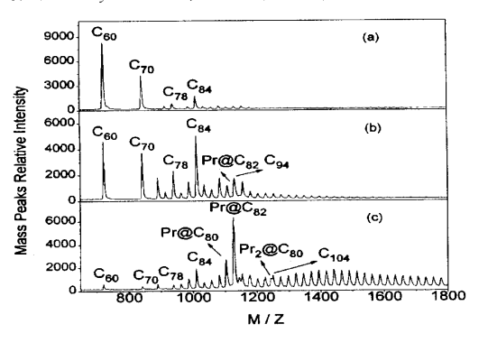 Рис. 5. Масс-спектр второго о-ксилольного экстракта. В работе [19] было предложено для увеличения выхода эндометаллофуллеренов проводить экстракцию под давлением и при высокой температуре, используя в качестве растворителей: толуол или пиридин. Масс-спектрометрический анализ толуольного экстракта (рис. 6a) полученного с использованием аппарата Сокслета показал, что экстракт содержит в основном полые фуллерены, в то время как эндофуллерены присутствуют на уровне фона. Проводя экстракцию толуолом под высоким давлением и при температуре 200 0С, эффективность экстракции возрастает, но содержание эндофуллеренов в экстракте по данным масс-спектрометрии меньше, чем фуллеренов (рис. 6в). Заменив толуол (дипольный момент которого равен 0,36 D) на пиридином (с дипольным моментом 2,19 D) удалось получить экстракт с выходом 0,6 % от веса сажи. Экстракция проводилась под давлением и при температуре 200 0С. В масс-спектре пиридинового экстракта основным молекулярным ионом является Pr@C82 (рис. 6с).
