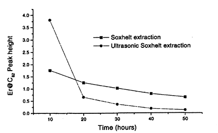 Рис. 7. Зависимость количества выделяемого Er@C82 от времени экстракции. Количество Er@C82 выделяемого за 10 часов в УЗСЭ много больше чем в СЭ. За 30 часов экстракции в УЗСЭ выделяется до 90 % металлофуллеренов, а в СЭ только 50 %. Схематически процесс экстракции с применением ультразвука можно представить, как разрушение сажевых агрегатов и сольватация ДМФА фуллеренов и эндофуллеренов. Результатом применения ультразвука является ускорение процесса экстракции, но получаемые экстракты по данным ВЭЖХ остаются низко обогащенными Er@C82. Расширение круга растворителей, используемых для экстракции эндоэдральных соединений из фуллеренсодержащей сажи, приводит к увеличению списка синтезируемых соединений. Так, применение для этой цели анилина [26] позволило выделить целую группу эндоэдральных соединений, куда вошли Y@C60, Ba@C60, La@C60, Ce@C60, Pr@C60, Nd@C60 и Gd@C60 при относительно низких температурах. При этом даже не понадобилось обеспечение анаэробных условий. Растворитель (анилин) прокачивался через сажу в течение 3 - 5 часов при температуре 273-278 К. Полученный экстракт исследовался в масс-спектрометре с лазерной десорбцией. Масс-спектр экстракта, полученного из сажи с помощью анилина, содержал пики указанных выше эндоэдральных соединений (рис. 8), причем интенсивность пиков, как правило, была соизмерима с интенсивностью пиков полых фуллеренов С60 и С70.
