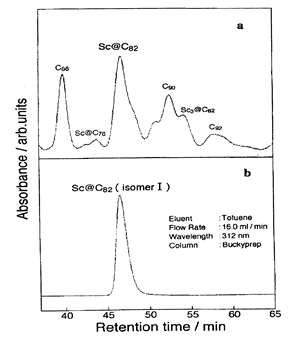 Рис. 9. Хроматограммы, иллюстрирующие последовательное хроматографическое разделением и очистку эндоэдрального соединения Sc@С82: (а) хроматограмма раствора обогащенного относительно Sc@С82; (б) хроматограмма раствора чистого Sc@С82(I). Таблица 1. Выделенные и очищенные эндометаллофуллерены.