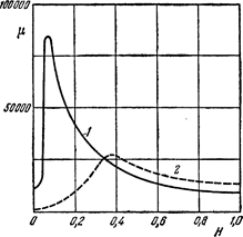 Рис. 10. Зависимость от Н у магнитного сплава пермаллоя (1) и у мягкого железа (2). Периодическое перемагничивание ферромагнитного образца связано с затратой энергии на его нагревание. Площадь петли гистерезиса пропорциональна количеству теплоты, выделяющейся в единице объема ферромагнетика за один цикл перемагничивания. При температурах ниже точки Кюри ферромагнитный образец разбит на малые области самопроизвольной (спонтанной) однородной намагниченности, называемые доменами. Линейные размеры доменов порядка (10-5 — 10-4 м). Внутри каждого домена вещество намагничено до насыщения . В отсутствие внешнего магнитного поля магнитные моменты доменов ориентированы в пространстве так, что результирующий магнитный момент размагниченного образца равен нулю. Намагничивание ферромагнитного образца во внешнем магнитном поле состоит, во-первых, в смещении границ доменов и росте размеров тех доменов, векторы магнитных моментов которых близки по направлению к магнитной индукции В поля, и, во-вторых, в повороте магнитных моментов целых доменов по направлению поля В. В достаточно сильном магнитном поле достигается состояние магнитного насыщения, когда весь образец намагничен по полю и его намагниченность J не изменяется при дальнейшем увеличении В. Измерения гиромагнитного отношения для ферромагнетиков показали, что элементарными носителями магнетизма в них являются спиновые магнитные моменты электронов . В современной квантово-механической теории ферромагнетизма объяснена природа самопроизвольной намагниченности ферромагнетиков и природа возникновения сильного внутреннего поля . Ферромагнитными свойствами могут обладать кристаллы веществ, атомы которых имеют не заполненные электронами внутренние оболочки , так что проекция результирующего спинового магнитного момента на направление магнитного поля отлична от нуля. При определенных условиях благодаря обменному взаимодействию между электронами соседних атомов, имеющему особую квантово-механическую природу, оказывается устойчивым такое состояние ферромагнетика, когда спины электронов всех атомов в пределах одного домена ориентированы одинаково. Таким образом возникает спонтанное намагничивание доменов до насыщения. При нагревании ферромагнетика до точки Кюри тепловое движение разрушает области спонтанной намагниченности и вещество теряет свои особые магнитные свойства. При отсутствии внешнего магнитного поля магнитные моменты отдельных доменов ориентированы хаотически и компенсируют друг друга, поэтому результирующий магнитный момент ферромагнетика равен нулю и ферромагнетик не намагничен. Внешнее магнитное поле ориентирует по полю магнитные моменты не отдельных атомов, как это имеет место в случае парамагнетиков, а целых областей спонтанной намагниченности. Поэтому с ростом Н намагниченность J и магнитная индукции В уже в довольно слабых полях растут очень быстро. Этим объясняется также увеличение м ферромагнетиков до максимального значения в слабых полях. Эксперименты показали, что зависимость В от Н не является такой плавной, а имеет ступенчатый вид. Это свидетельствует о том, что внутри ферромагнетика домены поворачиваются по полю скачком. При ослаблении внешнего магнитного поля до нуля ферромагнетики сохраняют остаточное намагничение, так 
